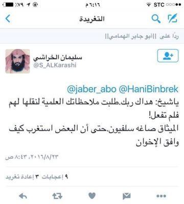وفي تغريدة حملت صورة لرد أطول رصدها "الشرق نيوز "قال الخراشي: التواصل مع علماء ودعاة اليمن تم بقرار سامي من خادم الحرمين، ومر بجهات حريصة على بلادنا واليمن من عدم الاختراق الصفوي، وهم أدرى مني ومنك بالمصلحة".