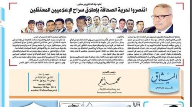 وقالت صحيفة الميثاق في عددها الصادر اليوم الإثنين، إن على عبدالعزيز بن حبتور (رئيس حكومة الحوثي/صالح) التحرك شخصياً للإفراج الفوري عن هؤلاء الصحافيين.