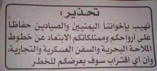 كما ألقى طيران التحالف منشورات تحذيرية على مدينة المخا، أهابت فيها بالمواطنين الابتعاد عن خطوط الملاحة البحرية والسفن العسكرية والتجارية، وأن أي اقتراب سوف يعرضهم للخطر.