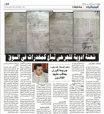 وأكدت الصحيفة " أنها حصلت على 6 ثائق تثبت دخول 6 حاويات قدماً تحمل 24 صنفاً من الأدوية البشرية ومن ضمنها أدوية مخدرة ومؤثرات عقلية تصل قيمتها إلى 2مليون و400ألف دولار ولاتقل قيمة بيعها عن 6 ملايين دولار .