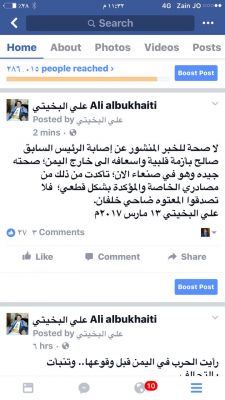 وقال البخيتي لا صحة للخبر المنشور عن إصابة الرئيس السابق صالح بأزمة قلبية واسعافه الى خارج اليمن؛ صحته جيده وهو في صنعاء الان؛ تأكدت من ذلك من مصادري الخاصة والمؤكدة بشكل قطعي؛ فلا تصدقوا المعتوه ضاحي خلفان.