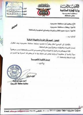 وفي التعميم الذي حصل ’’وطن نيوز‘‘ على نسخة منه ؛ قال المحافظ بن بريك ؛ ’’نظرا لما تقتضيه مصلحة محافظة حضرموت وبعد تكرار إصدار التعيينات والترقيات مركزيا ودون علم المحافظة فإننا نوجهكم بعدم قبول أية تعيينات وفي أي منصب من المناصب في المحافظة تصدر مركزيا سواء كانت رئاسية أو حكومية.