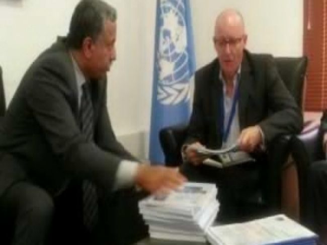 وسلم عارف الزوكا أمين عام حزب المؤتمر الشعبي العام جناح صالح الوثيقة مع مرفقاتها ونسخ خاصة باعضاء مجلس الامن الدائمي العضوية خلال لقاءه اليوم بالسيد جيمي ماكغولدريك منسق الشؤون الانسانية الممثل المقيم للامم المتحدة في اليمن .