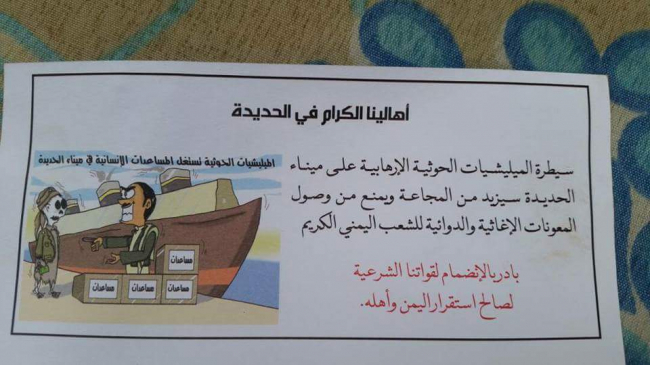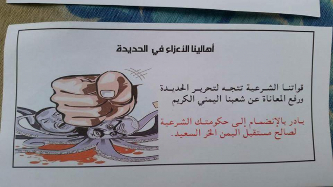 تفاجأ سكان مدينة الحديدة غربي اليمن صباح اليوم الأربعاء بمنشورات في شوارع المدينة تطالبهم بالإنضمام للشرعية. فيما يبدو أن مقاتلات التحالف العربي قامت بإلقائها.