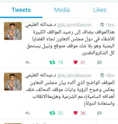 في اول تعليق على بيان مجلس التعاون الخليجي مساء اليوم الذي جدد مواقفه الثابتة تجاه وحدة وسيادة الجمهورية اليمنية والحفاظ على أمنها واستقرارها نشر مدير مكتب رئاسة الجمهورية الدكتور عبدالله العليمي باوزير تغريدات على صفحته بتويتر