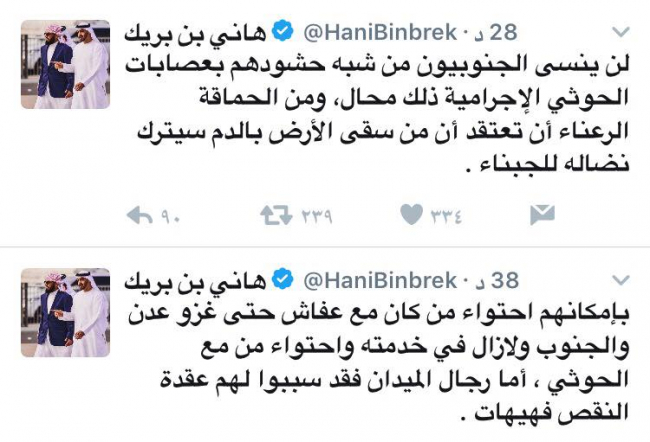 قال وزير الدولة المقال، هاني بن بريك، إن الجنوبيين، لن ينسوا من شبه حشودهم التي خرجت مؤخرا، بعصابات الحوثي، في إشارة إلى تصريحات بن دغر الأخيرة، وهو ما يعد تهديداً مبطناً من الوزير المقال هاني بن بريك.