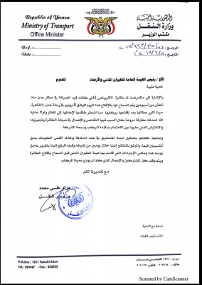 وجه معالي وزير النقل مراد الحالمي اليوم مذكرة الى رئيس الهيئة العامة للطيران المداني عقب الحادثة التي تعرضت لها طيران اليمنية اليوم.