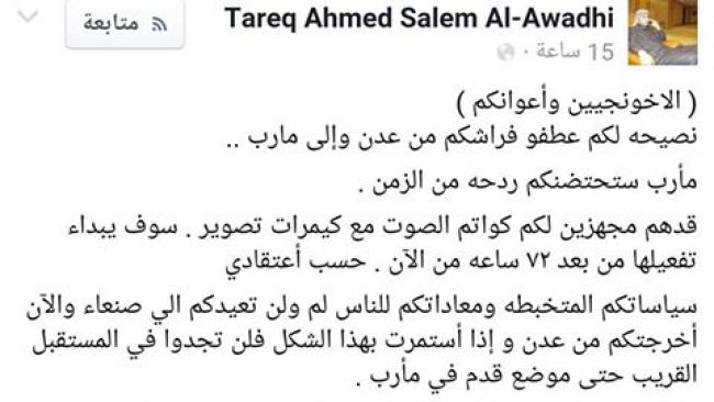 وحذر ناشطون في #بلاغ_للرأي_العام بالقول الشيخ طارق العواضي اخو القيادي في تحالف الانقلاب الشيخ ياسر احمد سالم العواضي يحدد في منشور له طريقة وموعد اغتيالات لقيادات وانصار الشرعية بالعاصمة المؤقتة عدن.