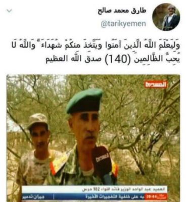 نشر نجل شقيق الرئيس السابق "العميد طارق محمد عبدالله صالح "في صفحته الشخصية بالفيس بوك صورة لقائد اللواء 102حرس جمهوري العميد عبدالواحد الوزير الذي قتل مع 5 من مرافقية بينهم قناص الحرس الجمهوري فهد اللساني .