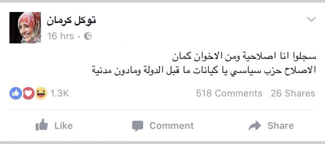 ونشرت "كرمان" على حسابها الشخصي على -فيسبوك- منشوراً قالت فيه: "سجلوا انا اصلاحية ومن الاخوان كمان الاصلاح حزب سياسي يا كيانات ما قبل الدولة ومادون مدنية".