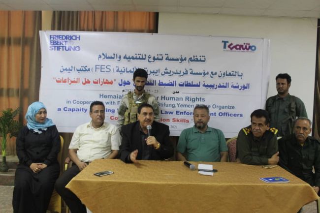 اختتمت مؤسسة تنوع للتنمية والسلام بالتعاون مع مؤسسة فريد ريش إيبرت الألمانية (FES) مكتب اليمن الورشة التدريبية ” لسلطات الضبط القضائي حول ” مهارات حل النزاع ” بمشاركة عدد من سلطات الضبط القضائي رجال الأمن والبحث الجنائي -عدن استمرت خلال الفترة 23-25فبراير 2021م .