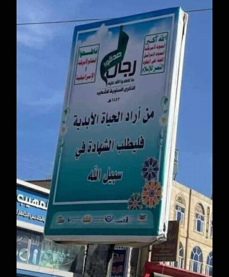 وتقول مليشيا الحوثي في تلك العبارة التي رفعتها في شوارع صنعاء: “من أراد الحياة الأبدية فليطلب الشهادة في سبيل الله”.. وقد أثارت تلك العبارة موجة واسعة من السخرية أوساط الناس الذين يرون بأنها تدعو البسطاء إلى ما أسمته بالحياة الأبدية عبر القتال في صفوفها، بيمنا هي لا تريدها ولا يدعو قادتها أنفسهم وأبنائهم للذهاب إليها، بل يريدون المكوث على قيد الحياة الغير أبدية في اليمن..!!.