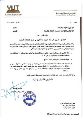 بينما المحافظات الجنوبية لا تعدو سوى 4 محافظات لن ينالها الضرر و ليس ذلك من الإنصاف.. و في ختام الرسالة طالب الإتحاد اليمني للسياحة رفع الضرر وتأمين مبالغ الحجاج وفق النظام والقانون..