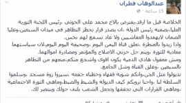 دعا القاضي الموالي لجماعة الحوثي عبد الوهاب قطران  رئيس ما يسمى بــ«اللجنة الثورية العلياء» محمد علي الحوثي لإصدار قرار بحظر التظاهر في ميدان السبعين . وأضاف قطران بأنه يتحمل