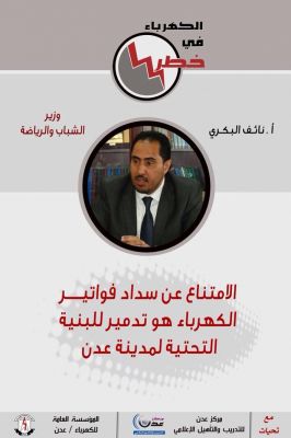 انطلقت اليوم الخميس الحملة الشعبية " الكهرباء في خطر " لتوعية وحث المواطنين والمستهلكين على سداد فواتير الكهرباء لمواجهة الضائقة المالية التي تمر بها المؤسسة العامة للكهرباء بعدن بهدف إنقاذها لضمان تحسين خدماتها المقدمة للمواطن.