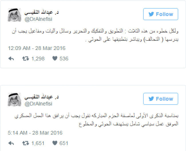 وأكد "النفيسي" أن لكل خطوه من هذه الثلاث: "التطويق والتفكيك والتحرير" وسائل واَليات ومفاعيل، يجب أن يدرسها (التحالف) ويباشر بتطبيقها على الحوثي.