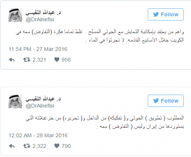 قال المفكر السياسي الكويتي المعروف الدكتور عبد الله النفيسي: "واهم من يعتقد بإمكانية التعايش مع الحوثي المسلح"، مؤكدًا أن فكرة (التفاوض) معه في الكويت خلال الأسابيع القادمة غلط تمامًا.