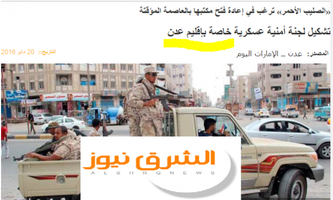 نشر موقع الأمارات اليوم خبر قبل قليل عن تشكيل لجنة أمنية وعسكرية خاصة بإقليم عدن، مختصة بمهام تأمين المحافظات الواقعة في إطار اقليم عدن