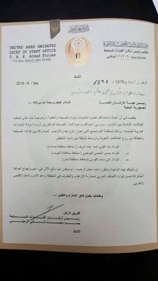 وتبين الوثيقة عن إستدعاء الإمارات لكلاً من اللواء/ عبدالقوي عباد أحمد الشريف محافظ محافظة صنعاء، واللواء حسين العجمي العواضي محافظ محافظة الجوف، واللواء علي محمد القوسي محافظ محافظة ذمار.