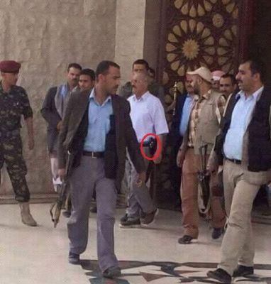 وهذه المرة وخلال ظهوره المفاجئ ظهر صالح برفقة حراسته، ولكن ما يثير الريبة هو السلاح الشخصي الذي يلبسه. ودائما ما يصاحب ظهور صالح رسالة موجهة إلى خصومه والموالين له، ويبدو أن الرسالة وصلت . ولأول مرة ظهر صالح وهو يرتدي سلاح شخصي من نوعية "مسدس أبو عجلة" كما يعرفه اليمنيون الامريكي الصنع.