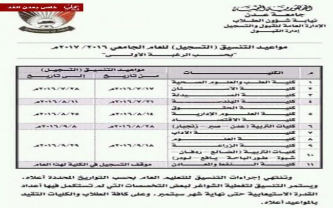 أصدرت إدارة القبول التابعة للإدارة العامة للقبول والتسجيل في نيابة شؤون الطلاب بجامعة عدن الجدول المتعلق بمواعيد التنسيق (التسجيل) للعام الجامعي 2016م / 2017م، والمخصص للرغبة الأولى للطالب الراغب بالالتحاق في أي كلية من كليات الجامعة.