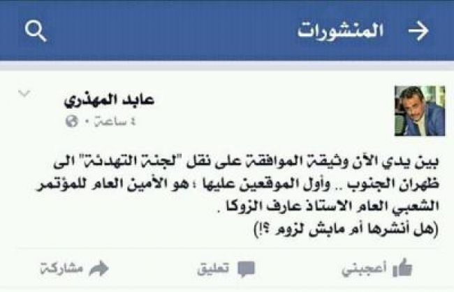 و رد المهذري علی مصادر رفيعة حاولت التنصل من موافقت حزب المؤتمر في نقل لجنة التهدئة من الكويت الی مدينة الظهران بجنوب السعودية.