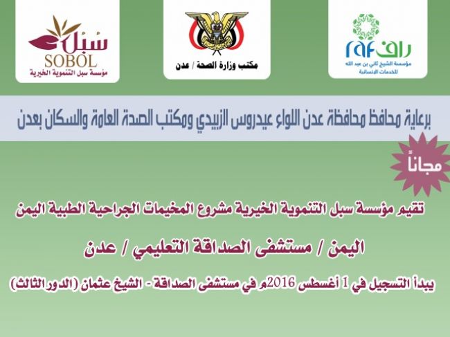 برعاية محافظ محافظة عدن اللواء/ عيدروس الزبيدي ومكتب الصحة العامة والسكان تقيم مؤسسة سبل التنموية الخيرية بدعم من مؤسسة راف (مؤسسة الشيخ ثاني بن عبدالله للخدمات الإنسانية) المخيم الطبي الجراحي المجاني بمحافظة عدن ضمن مشروع المخيمات الطبية الجراحية في اليمن.