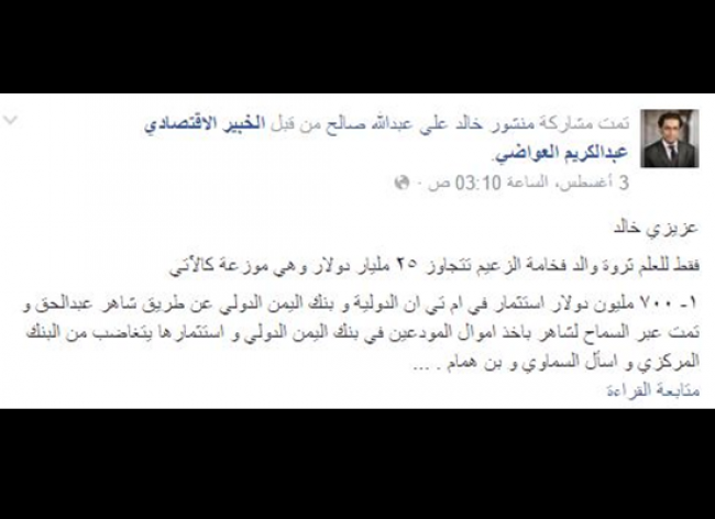 ولفت العواضي أيضا إلى مبلغ 1,2 مليار دولار استثمارات في شركة اتصالات للهاتف الخلوي وبنكين وطنيين، ومبلغ 900 مليون دولار على شكل عقارات داخل اليمن وفي باريس ولندن ومدن عربية.