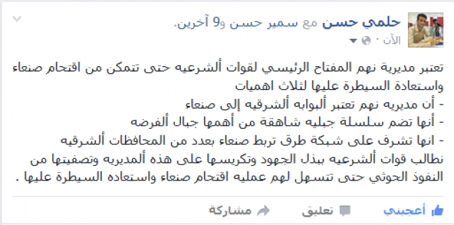 وطالب حلمي حسن قوات ألشرعيه ببذل الجهود وتكريسها على هذه ألمديريه وتصفيتها من النفوذ الحوثي والتي ستسهل لهم عمليه اقتحام صنعاء واستعاده السيطرة عليها .