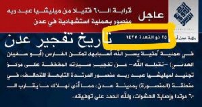 وكان انتحاري فجر سيارته أمس الاثنين وسط تجمع لمجندين يتبعون المقاومة في حي السنافر بمدينة عدن، وتبنى تنظيم الدولة الإسلامية “داعش” الهجوم الانتحاري وقال إنه أودى بحياة 60 من مليشيا هادي، حسب وصفه.