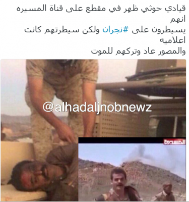 تداول ناشطون، على مواقع التواصل الاجتماعي، صورة لناشط حوثي زعم أنه قام بالسيطرة على نجران بالكامل، وذلك في مقطع مصور على قناة المسيرة الداعمة لانقلاب ميلشيات الحوثي والمخلوع.
