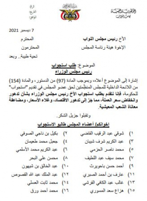 وأظهرت الوثيقة الموقعة من 16 نابًا في مجلس النواب، من مختلف الكتل السياسية توجيهًا باستجواب رئيس الوزراء، معين عبدالملك، بشأن انخفاض سعر العملة، وتدهور الاقتصاد، وغلاء الأسعار، ومضاعفة معاناة الشعب المعيشية.