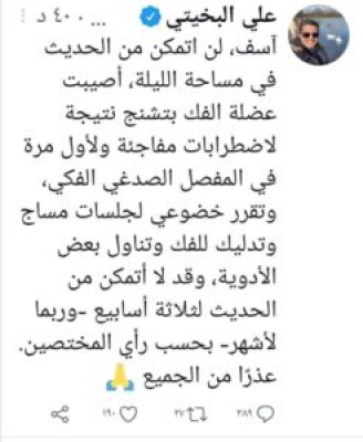 وقال البخيتي في تغريدة كتبها في تويتر رصدها وطن نيوز انه لن يتمكن الليلة من الحديث في مساحة التويتير بسب مرضه .