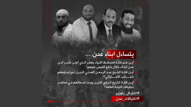 انطلقت الخميس حملة الكترونية شعبية، للمطالبة بالتحقيق في جرائم الاغتيالات المستمرة، التي أودت بحياة العشرات من الأبرياء في العاصمة المؤقتة عدن خلال السنوات الأخيرة.