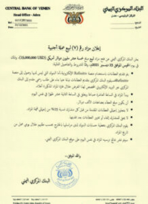 وأقر البنك المركزي في عدن فتح سابع مزادات بيع العملة الأجنبية بقيمة 15 مليون دولار على أن يجري تنفيذه يوم الخميس 23 ديسمبر 2021م .