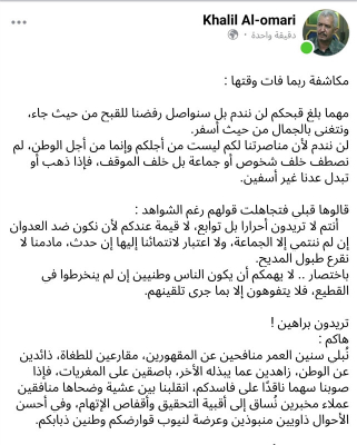 ونشر الصحفي العمري مراسل قناة المنار اللبنانية ـ القناة الرسمية المتحدثة باسم حزب الله ـ منشور على صفحته في فيسبوك قال فيها إن ميليشيا الحوثي استأثرت بكل المناصب والمصالح الحكومية واحتكرتها على فئة محدودة من المطبلين والتابعين لها.