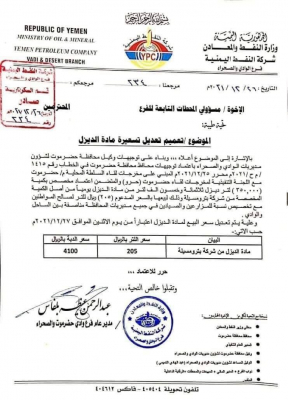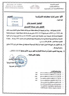 وحصل وطن نيوز على وثيقة رسمية من مدير عام فرع شركة النفط اليمنية بمحافظة حضرموت خالد سلمان العكبري، وجه فيها مدير محطات الشركة في الوادي والساحل ببيع الديزل للمواطنين في كافة محطات الشركة بالسعر المدعوم بقيمة 205 ريال للتر الواحد ابتداء من الساعة الثانية من ظهر يوم الاثنين 27 ديسمبر 2021م.