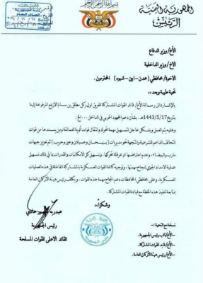وتداول ناشطون صورة لمذكرة منسوبة إلى الرئيس هادي دون التأكد من صحتها، وتحتوي على توجيه من الرئيس إلى محافظي محافظات عدن وأبين وشبوة بشأن تسهيل مرور قوات العمالقة والتعاون معها لحرير مديريات بيحان وعسيلان وعين غرب محافظة شبوة، ومديرية حريب جنوب محافظة مأرب.