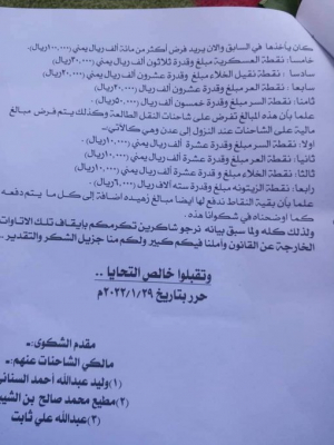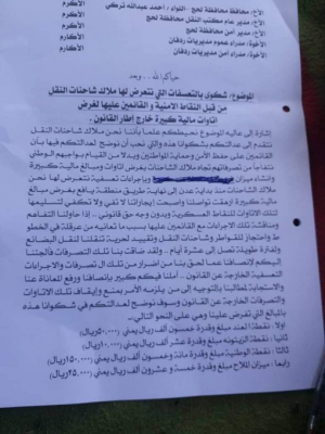 وأظهرت شكوى تقدم بها سائقو الشاحنات وحصل " وطن نيوز " على نسخة منها حجم الأموال المهولة التي تفرضها النقاط الأمنية التابعة للمجلس الانتقالي على الشاحنات كجبايات .