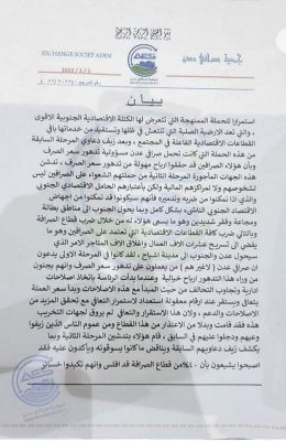 ان جمعية صرافي عدن لتؤكد مجددا ان قطاع الصرافة كان ولا يزال يعمل وفق القوانين المنظمة وانهم مثل باقي القطاعات يحققون ارباحا في اعمالهم ليست كما يصفها المأجورين (بالفلكية ) وانهم يعملون وفق ضوابط ولوائح صارمة وباشراف البنك المركزي اليمني ويخضعون جميعا لمراجعة وتدقيق مكاتب محاسبة قانونية معتمدة لدى البنك المركزي وترفع تقارير هذه المراجعة لقطاع الرقابة في البنك المركزي ، وبالتالي فهم اكثر فئة تعمل وفق معايير تكفل استمرار عملهم وتفادي كافة المخاطر التي تتعرض لها كافة القطاعات الاقتصادية ، وفي هذا الصدد فاننا نتوجة الى عموم الناس ونطمأنهم بأن لا صحة ولا اساس لما يتم الترويج له وبأمكان الناس التماس هذا الامر بأنفسهم في معاملتهم اليومية، كما تذكر جمعية صرافي عدن بانها وربما الجمعية الوحيدة التي تعمل الى جانب ادارة البنك المركزي للحفاظ على التعافي الحاصل للريال اليمني وتعمل معه على استمرار هذا التعافي وتحقيق مستويات جديدة من التحسن ان شاء الله .