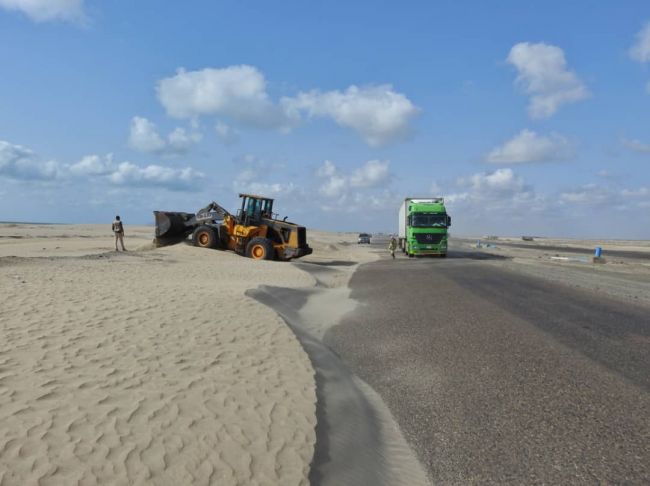 واصل صندوق صيانة الطرق بتنفيذ عمليات إزاحة ورفع الرمال من الطريق الدولي الرابط بين محافظة عدن وأبين.