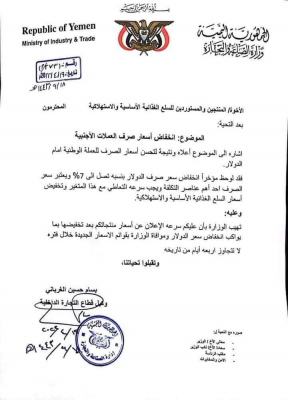 و أمهلت وزارة الصناعة والتجارة بحكومة مليشيا الحوثي غير المعترف بها، في تعميم له التجار ومصنعي المواد الغذائية بخفض أسعارها بما يتوافق مع انخفاض أسعار الصرف خلال أربعة أيام .
