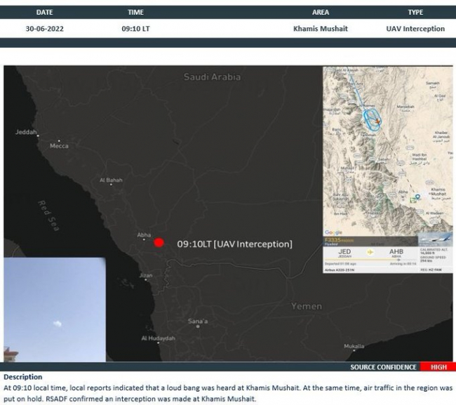 وكانت شركة "أي او اس جروب" البريطانية، أكدت أنه في الساعة 9:10 صباحا بالتوقيت المحلي سمع دوي انفجار في خميس مشيط، وأن القوات الجوية الملكية السعودية اكدت حصول اعتراض لهجوم جديد.