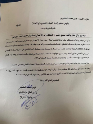 وكشفت وثيقة، عن تعرض رجل الأعمال إسماعيل محمد أحمد الحبابي، للتقطع والنهب والتهديد بالقتل، في شارع الستين الغربي، يوم السبت الماضي، من قبل عصابة مسلحة على متن سيارتين.