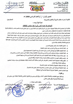 وأظهرت وثيقة صادرة عن مكتب التربية والتعليم بمحافظة عمران تخاطب مديري مكاتب التربية في المديريات، بإقامة فعاليات طائفية بمناسبة ذكرى الانقلاب 21 سبتمبر.