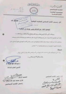 مراقبون يرون ان الوثيقة المسربة اليوم تعد سرية وهامة وخطيرة وان مكتب الامين العام المساعد للمجلس السياسي للمقاومة بالقاهرة _ هو من سرب هذه الوثيقة اليوم _ رغم مضي اكثر من عام ونيف على صدورها واعتمادها ...