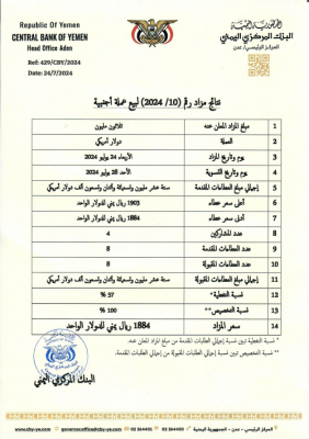 جاء ذلك في بيان للبنك المركزي، نشره على موقعه الرسمي، اعلن فيه نتائج المزاد العلني رقم (10) لهذا العام 2024، لبيع 30 مليون دولار أمريكي.